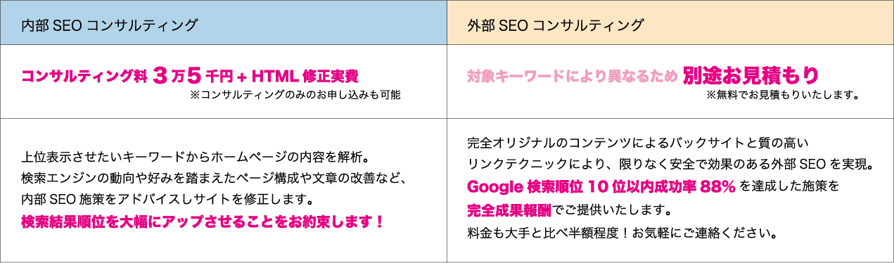 SEO対策には内部施策・外部施策があり、両方行うことが望ましいですが、どちらかの施策だけでも驚くほど効果があることを実感していただけると思います。