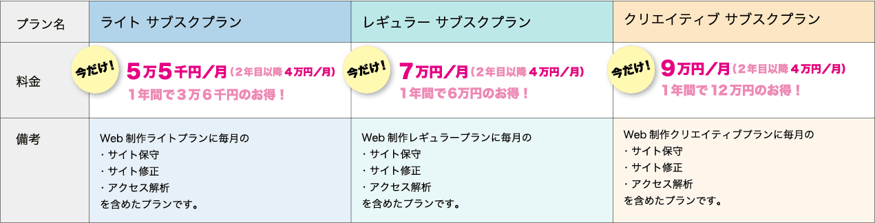 Web制作プランにサイト保守を含めた月払いのお得な定額プランです。